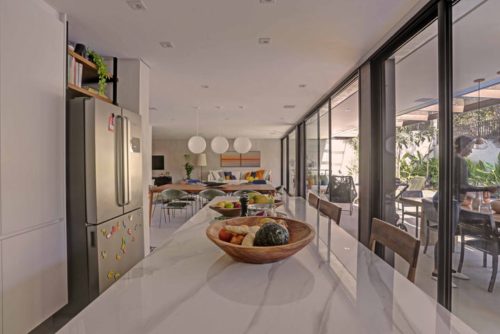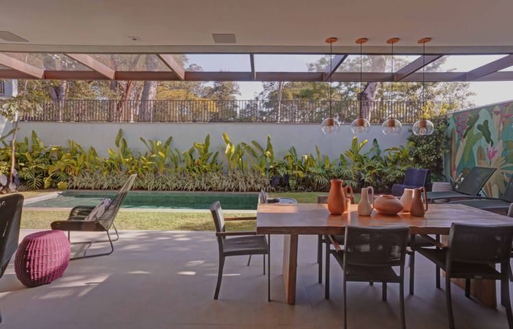 “O que é mais curioso no projeto, para mim, é ver as palmeiras imperiais saindo do subsolo e dando à luz da sua presença com suas copas voltadas para os pavimentos superiores. Elas saem de uma abertura central no terreno onde as residências foram dispostas de acordo com o formato trigonal do lote”, diz Monica Drucker, arquiteta e sócia-fundadora da Drucker Arquitetura.